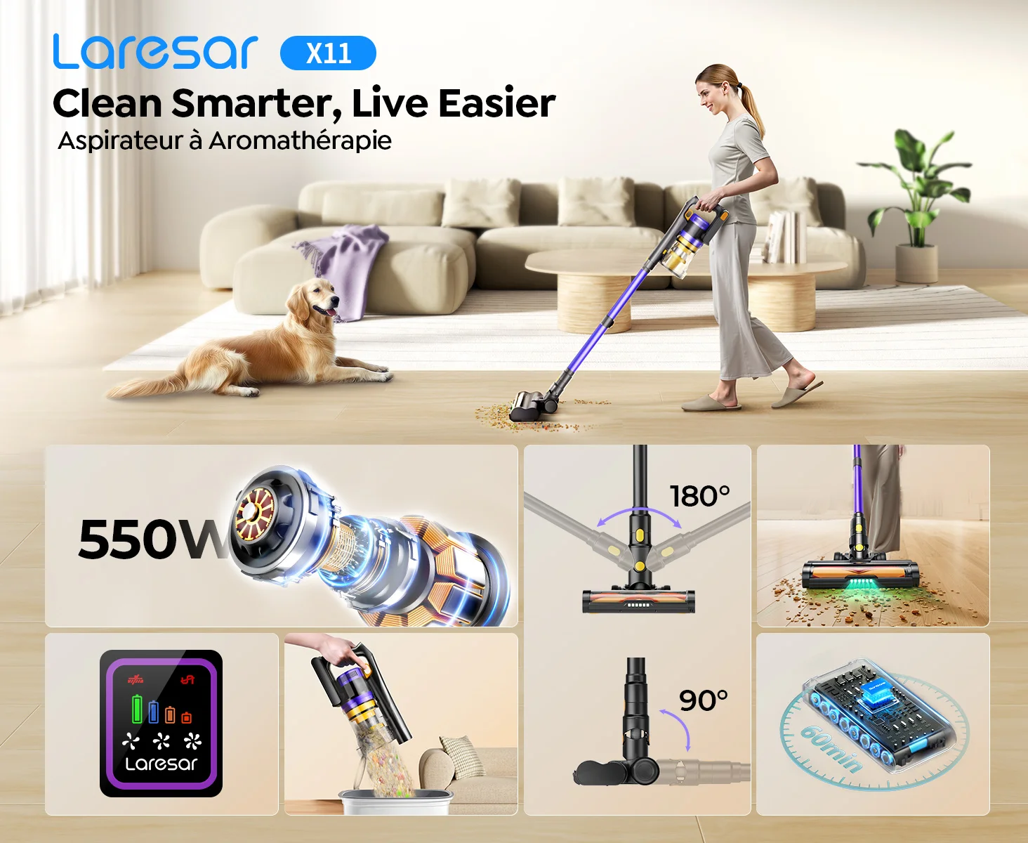 ⏰ 【60 𝙈𝙞𝙣𝙪𝙩𝙚𝙨 𝙙'𝘼𝙪𝙩𝙤𝙣𝙤𝙢𝙞𝙚】 L'aspirateur sans fil Laresar X11 dispose d'un moteur haute performance de 550W qui peut fournir une aspiration puissante jusqu'à 55000Pa,avec 3 options de vitesse. L'aspirateur peut efficacement enlever la poussière, les cheveux, la litière de chat et plus encore, ce qui le rend parfait pour les planchers, les tapis,